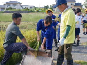 歓迎式の後、体育館での「ハンカチ落とし」「だるまさんが転んだ」や石田浜海水浴場での「海水浴」「スイカ割り」を楽しみました。